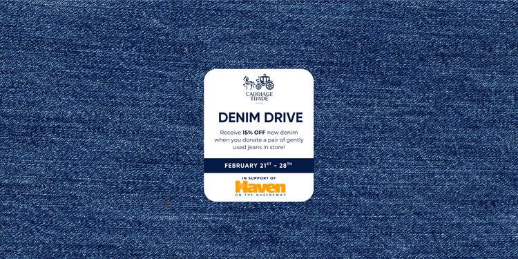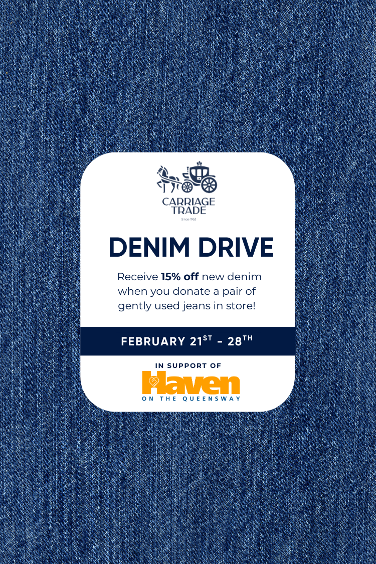 Swap your old denim for a fresh fit, and help us make a difference! From February 21st to the 28th, bring in a pair of gently used jeans and get 15% off a brand-new pair. It’s a win-win: you get a new fit, and you help outfit women in need through our partnership with Haven on the Queensway! Since 2009, Haven on the Queensway has been empowering local families, seniors, and those experiencing homelessness, and we’re so proud to be part of their mission. Ready to give back? Donate your old denim and score a stylish, feel-good...