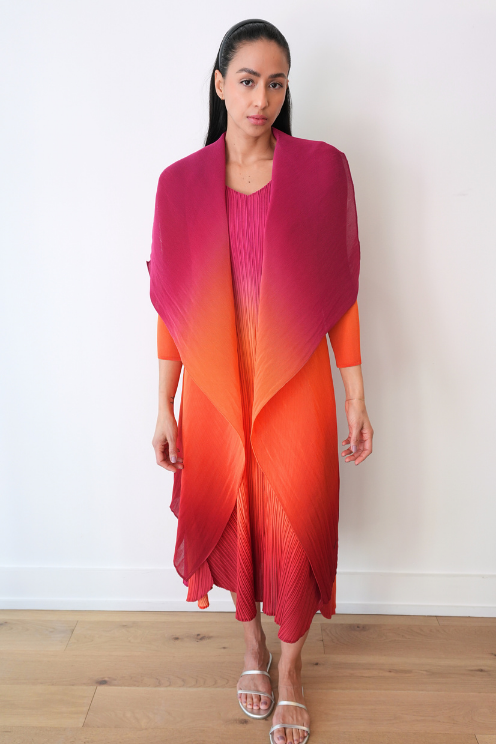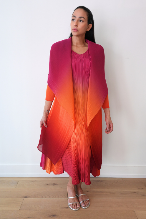 The Collare Coat is reminiscent of a waterfall. The beautiful pleated folds created within the chiffon material make it an easy to wear Alquema piece and is perfectly paired with the Long Estrella Dress.