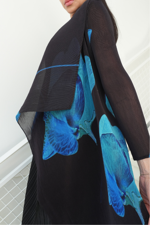 The Collare Coat is reminiscent of a waterfall. The beautiful pleated folds created within the chiffon material make it an easy to wear Alquema piece and is perfectly paired with the Long Estrella Dress.