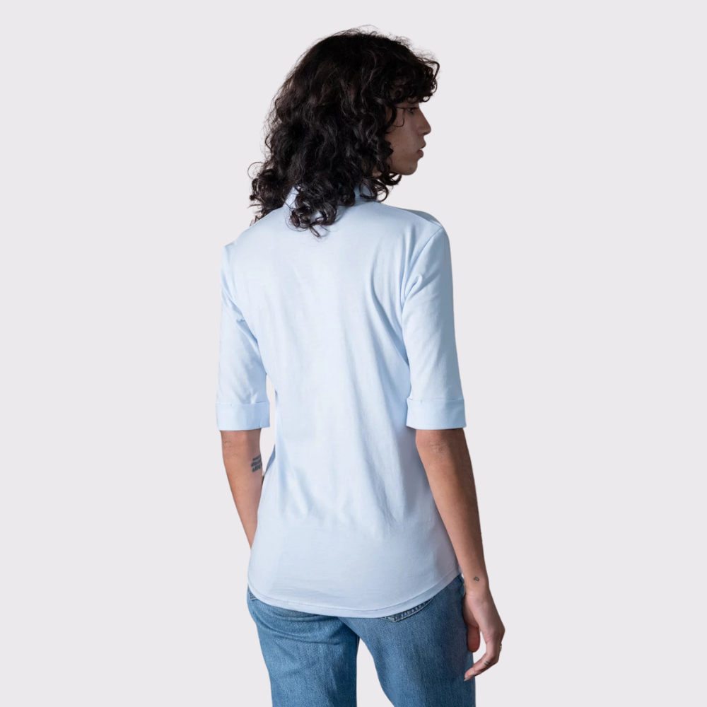 Experience ultimate summer comfort with this sleek V-neck shirt crafted from 100% premium Pima Cotton jersey. The fitted silhouette accentuates your shape while above-elbow sleeves with stylish cuffs add a touch of sophistication. Incredibly lightweight, this Anonym Lili shirt is your perfect companion for staying cool and looking effortlessly polished during the hottest summer days.