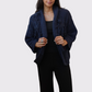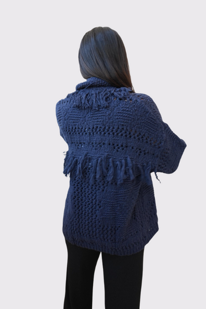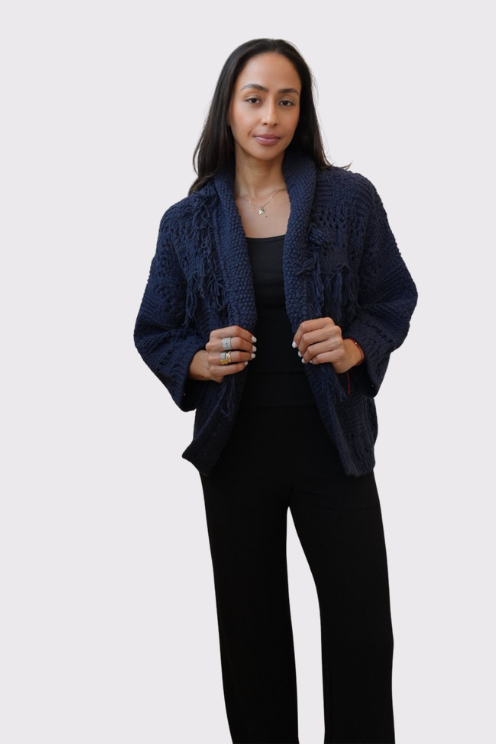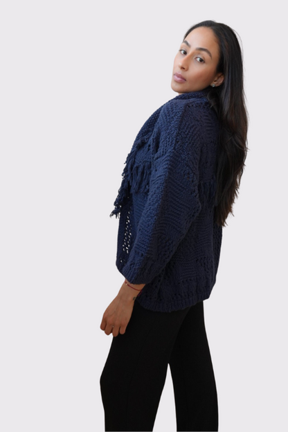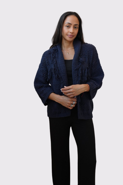 Bohemian flair meets cozy luxury. This open-front cardigan features a chunky crochet-knit design with rich texture, fringe detailing, and a soft shawl collar that drapes effortlessly. The deep navy hue and open weave create a perfect balance of laid-back and elevated—ideal for layering on cool days or cozy nights in.
