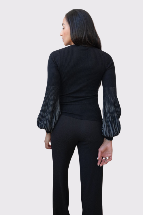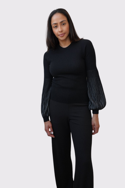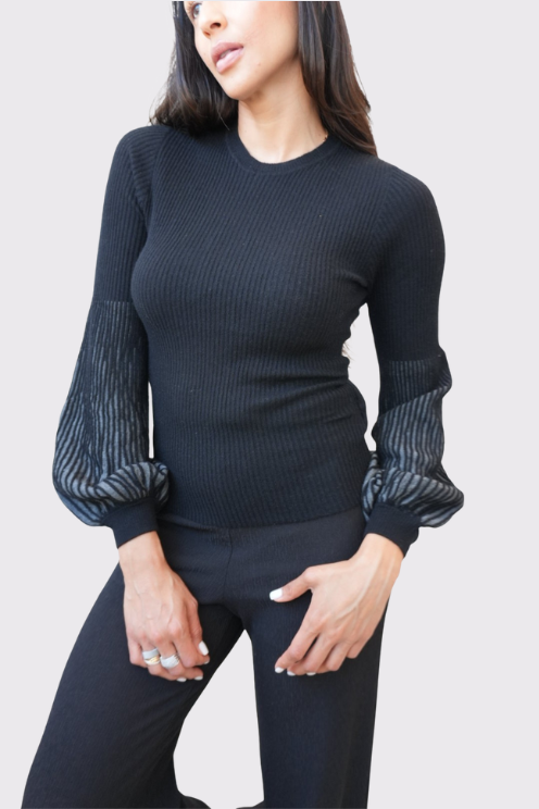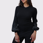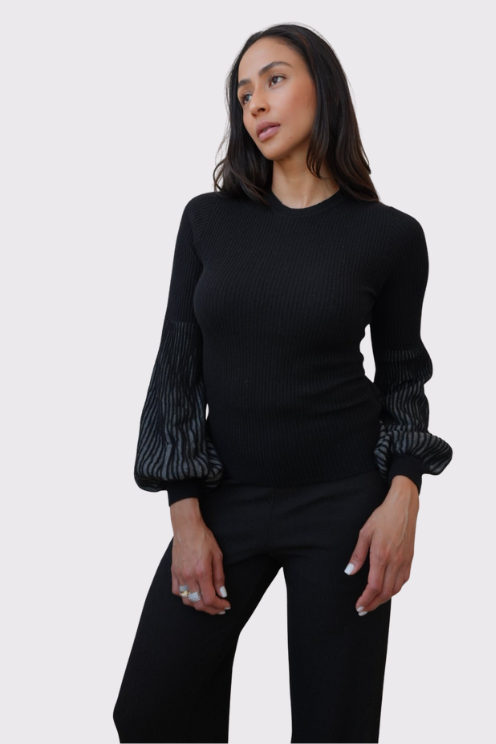 A modern classic with a dramatic twist. This fitted rib-knit crewneck sweater is elevated by voluminous, two-tone Juliette sleeves crafted in a subtly sheer, textured fabric. The contrast in textures adds dimension, while the sleek silhouette keeps it effortlessly elegant.