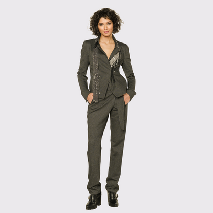 A sharply tailored statement blazer that blends structure with sleek sophistication. Cut in a rich charcoal suiting fabric, this jacket follows the body with clean lines, soft shoulders, and a subtly defined waist. The notched lapel and streamlined silhouette make it a polished essential—perfect paired with matching trousers for a modern set or styled with denim for an effortless high-low moment.