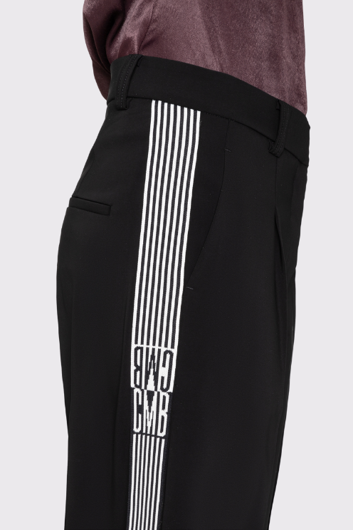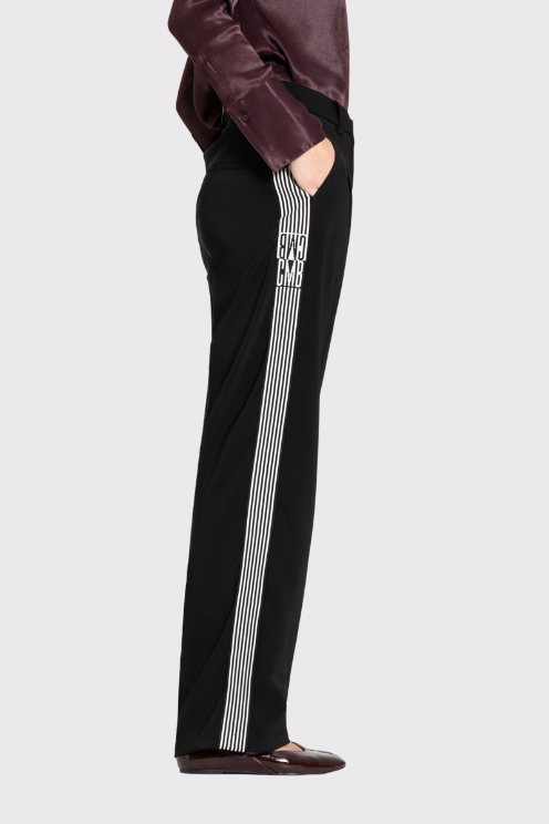 The Etienne Pant by Cambio is where sporty attitude meets polished tailoring. Designed with a relaxed straight-leg fit, this standout pant features bold white side stripes with graphic “CMB” logo detailing for a modern, elevated twist on athleisure. Crafted in a soft, stretchy fabric, it offers all-day comfort without compromising style. Dress it up with a blazer and loafers or keep it cool with sneakers and a tee.