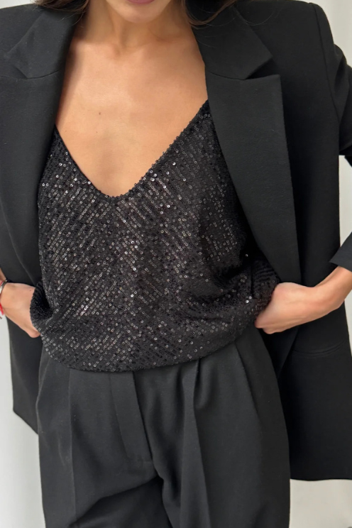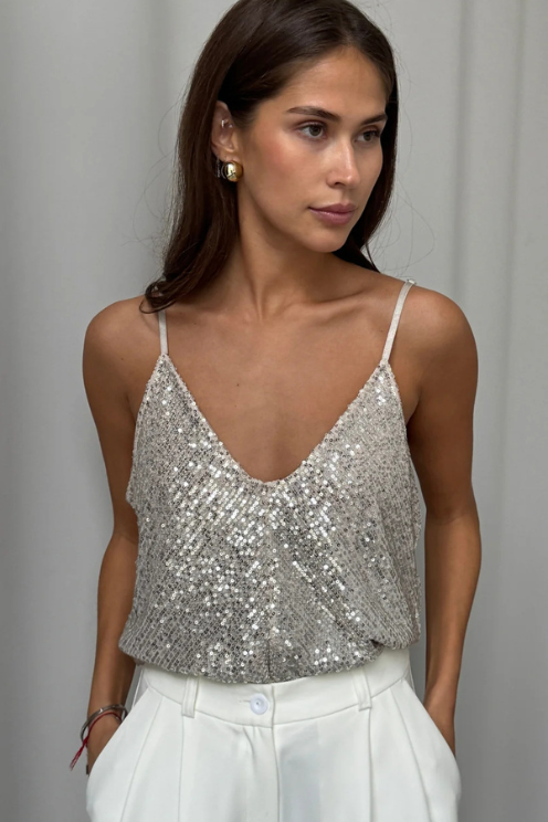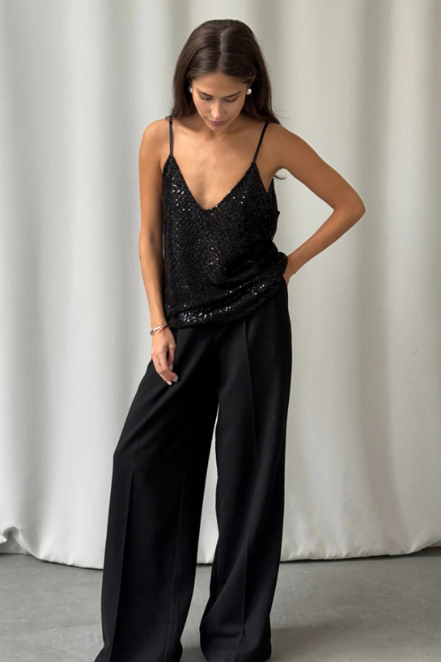 Sienna Sequin Camisole is the perfect seasonal item for plans this festive season. V-shaped neckline with matching back and adjusters to suit any shape. Lined with soft jersey fabric for comfort. Team with a jacket or any soft tailoring trouser for an effortlessly chic look.