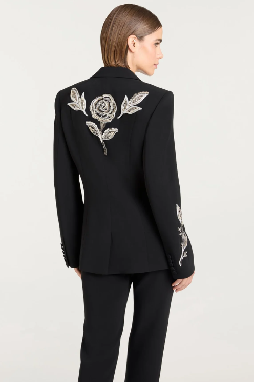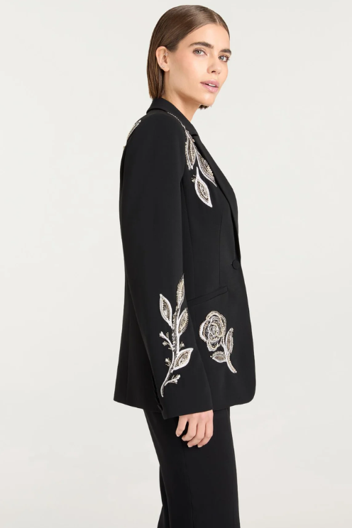Step up your style game with the Metal Paisley Karlie Blazer—a fresh twist on the classic black blazer. Decked out with delicate beaded floral designs, it adds just the right pop of sparkle without shouting for attention. Whether you're powering through meetings or lighting up the night, this blazer brings playful elegance with a dash of charm to any look.