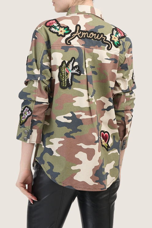 Cinq à Sept takes the classic camo jacket to a new level with bold embroidered patches and sequined accents that balance utility with feminine charm. Designed in sturdy cotton twill, it features flap pockets, button closures, and a relaxed fit that makes it an easy statement layer. Finished with words like “bonjour” and “amour” across the chest and back, this jacket delivers instant personality—whether styled with denim, leather, or thrown over a dress for contrast.