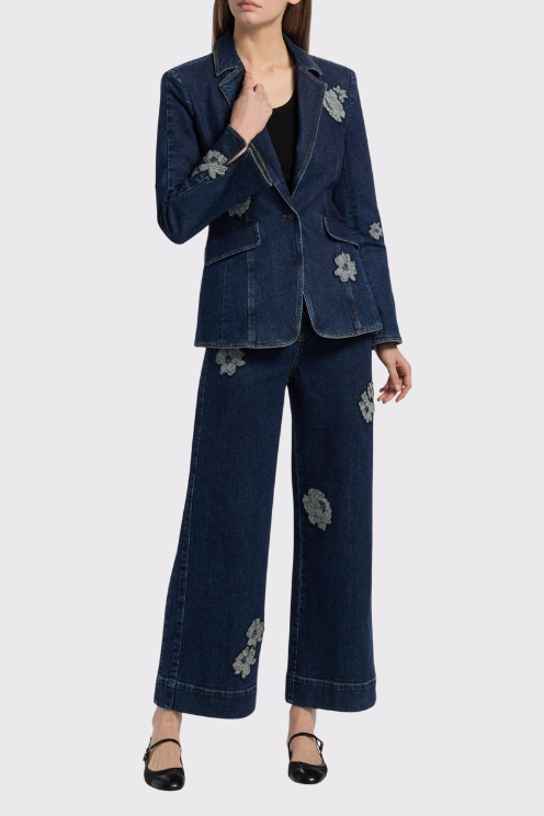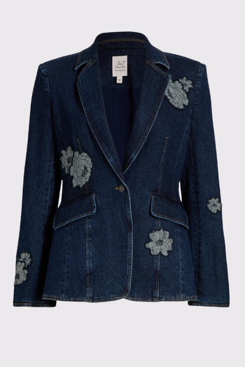 The Floral Applique Milly Jacket by Cinq à Sept adds a whimsical twist to classic denim with charming floral appliqués and wide notch lapels. It’s the perfect playful layer to brighten up your everyday look with a touch of fun and flair.