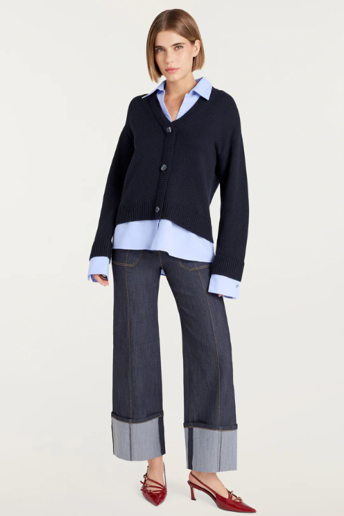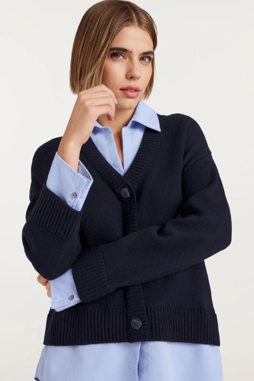 The Megan Pullover is a versatile piece that adds a touch of sophistication to any outfit. With its cardigan style, button front, and collared neckline, it effortlessly elevates your look. The prestyled poplin top underpinning adds an extra layer of comfort and style. Stay chic and cozy with its long sleeves.