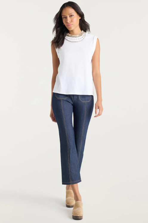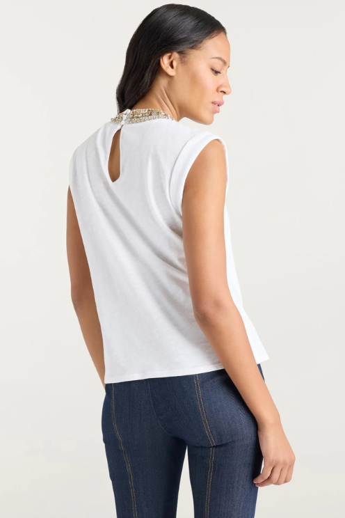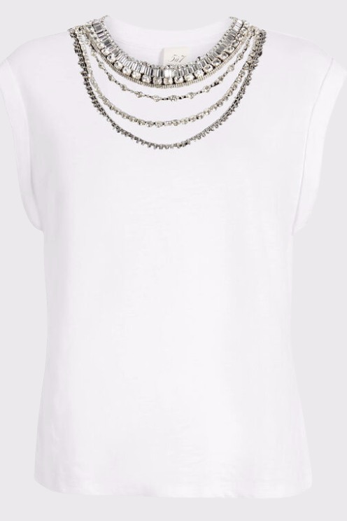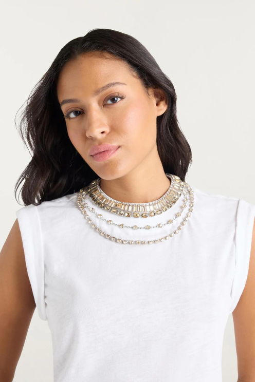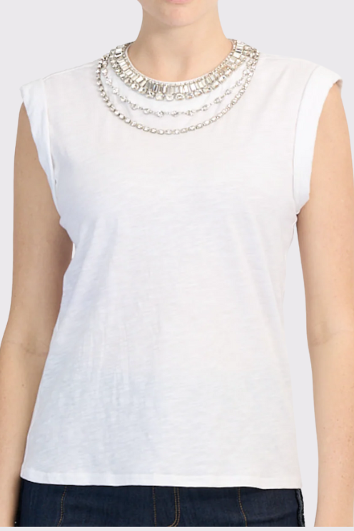 Take your wardrobe up a notch with the Layered Necklace Bella Tee. Combining cozy comfort with bold style, this sleeveless top boasts a dazzling embellished necklace that transforms any look. Be bold, be bright, and let this playful piece make you the star of the show.