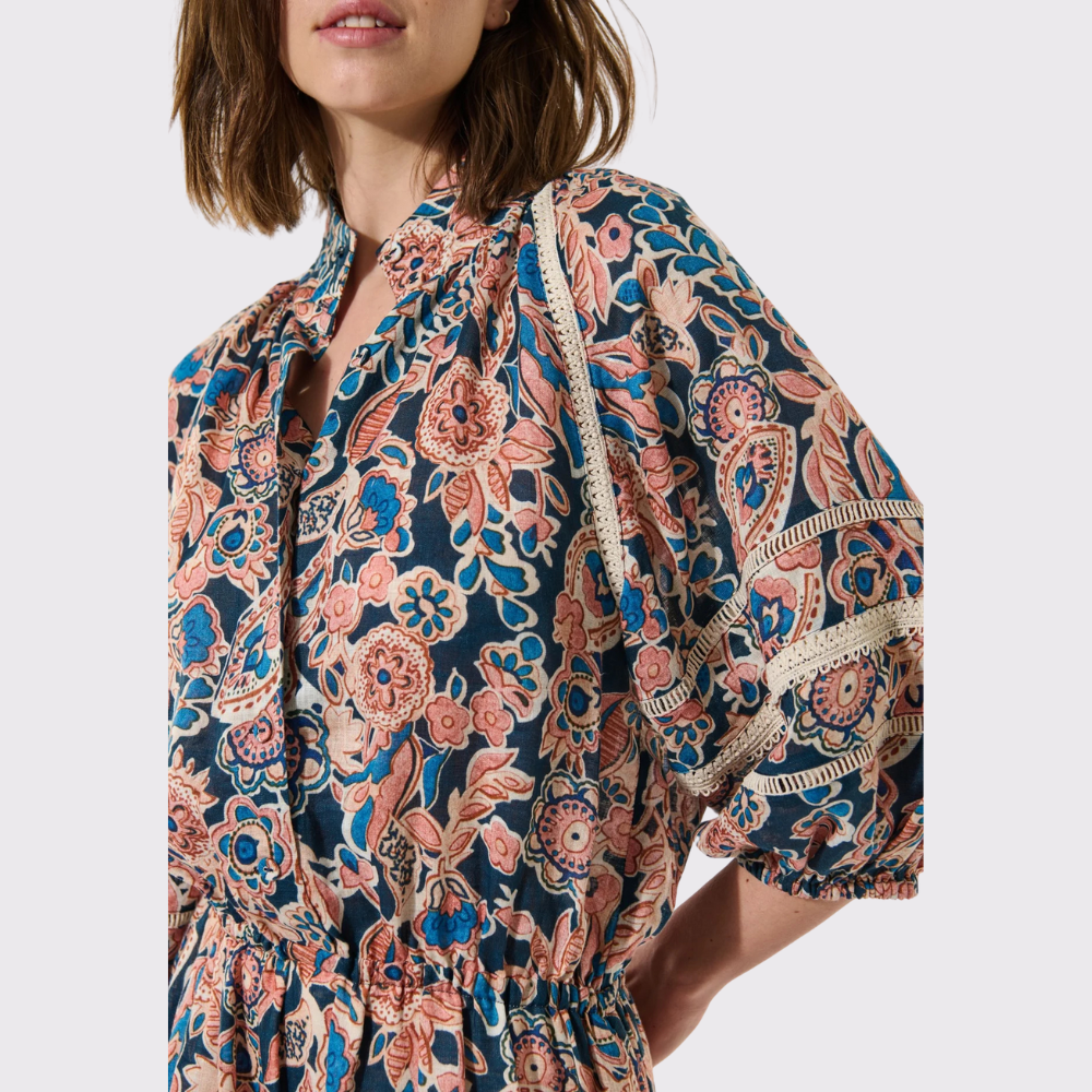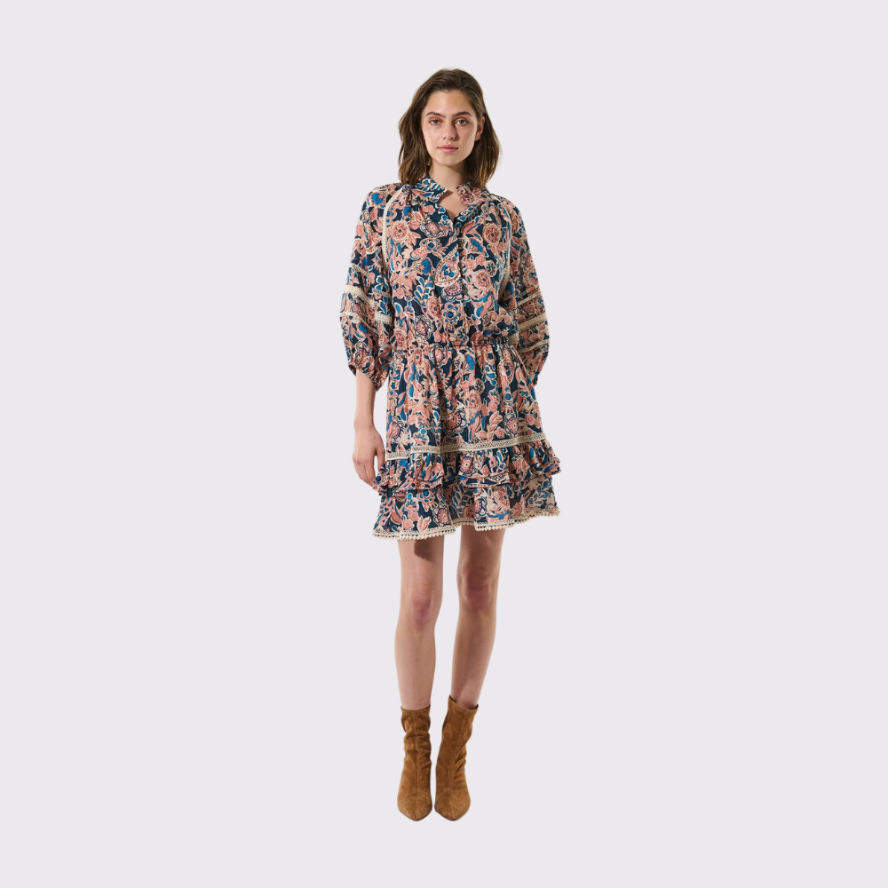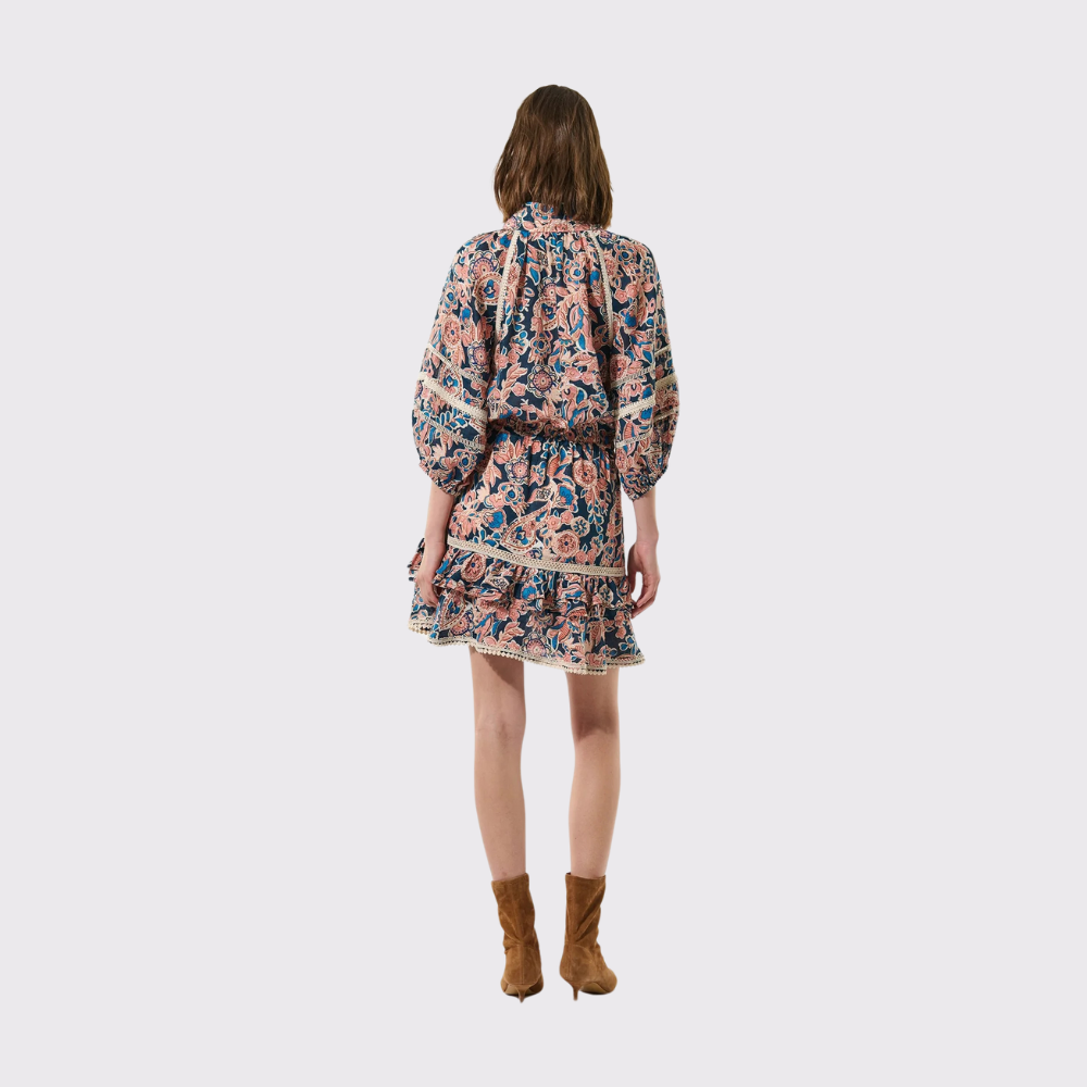 This Dea Kudibal dress features a fresh and feminine look with a relaxed, short fit and ruffled skirt. The lace tape inserts on the shoulders and flounces add delicate detail to the floral printed linen, while the stand collar keeps a demure touch. Perfect for a carefree yet chic style.
