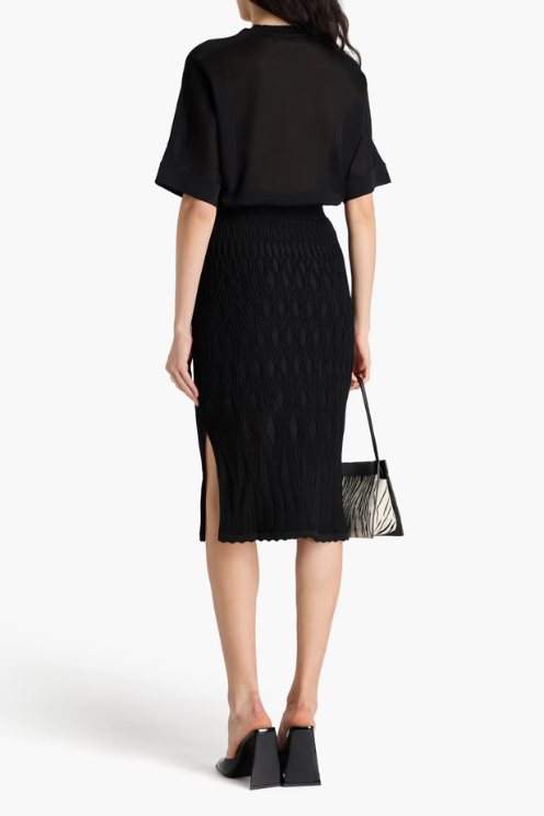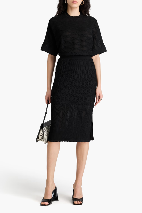 Elevate your wardrobe with the DVF Cairo Top. Its textured jacquard knit offers a luxurious touch while the high neck, wide sleeves, and cropped fit accentuate your figure. This versatile top effortlessly goes from day to night, making it a must-have for any fashion-forward individual.