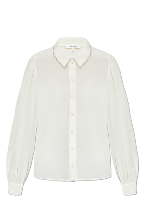 FRAME's creamy silk blouse strikes the perfect balance between understated elegance and subtle glamour. The relaxed, minimalist silhouette features delicate gathers at the sleeve seams that add movement and dimension without compromising its timeless appeal. What truly sets this piece apart is the classic elongated collar, delicately adorned with gold and silver crystal and sequin details that catch the light just right. Crafted from luxurious silk with a noble sheen, this blouse works effortlessly from office to evening, offering that coveted "elevated basics" vibe that never goes out of style.