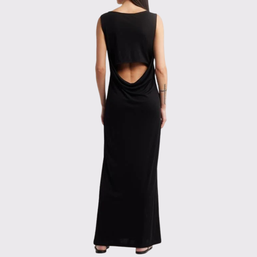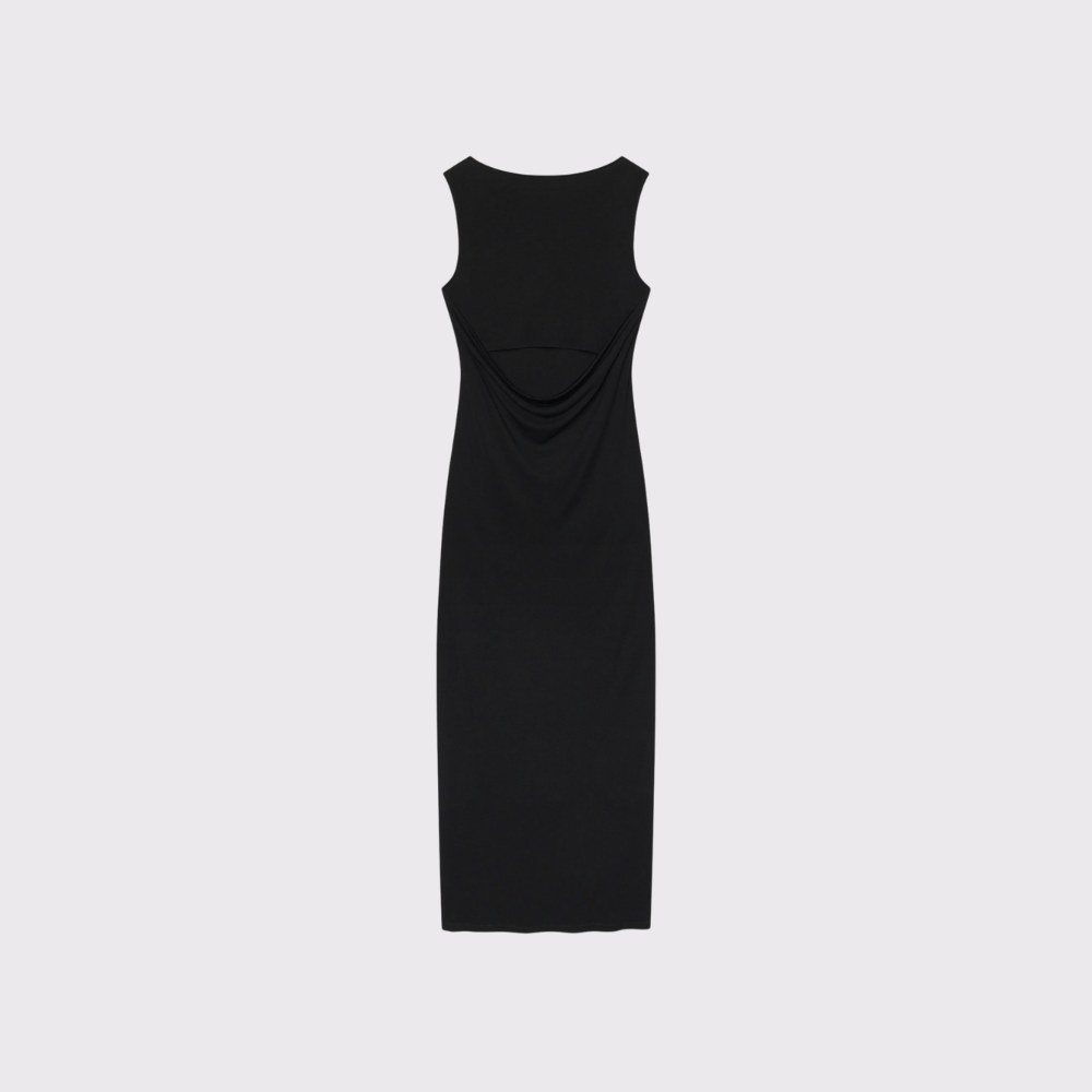Introducing the chic older sister of the little black dress. Minimalism meets sensuality in our Frame The Drape Dress. The backless design features a subtle drape detail, revealing just the right amount of skin. Say goodbye to bra woes and hello to practicality and sophistication.