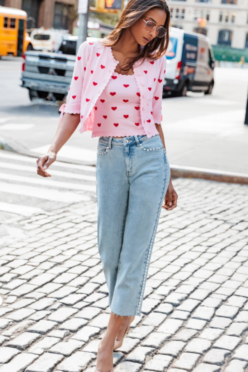 The Lottie Hearts Tank delivers playful romance with its slim fit and heart-patterned intarsia knit. The fitted, cropped silhouette layers seamlessly under cardigans or stands alone as a fun, standout top. Pink and red add cheerful vibrancy perfect for transitional dressing. Wear with the Tess Hearts Cardigan for a full matching set.