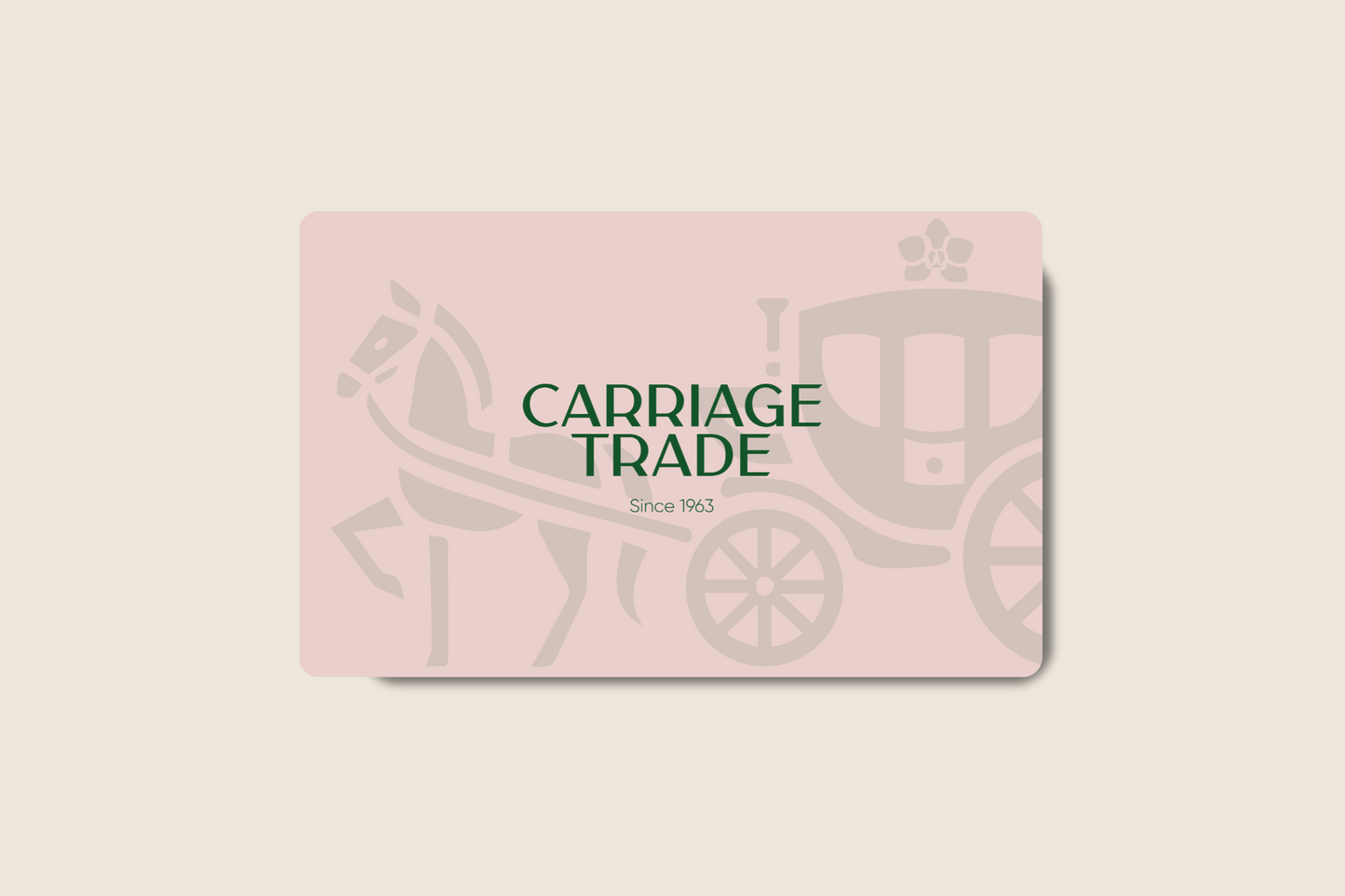 Shopping for someone else but not sure what to give them? Give them the gift of choice with a Carriage Trade Gift Card. Gift cards are delivered by email and contain instructions to redeem them at checkout. Our gift cards have no additional processing fees.