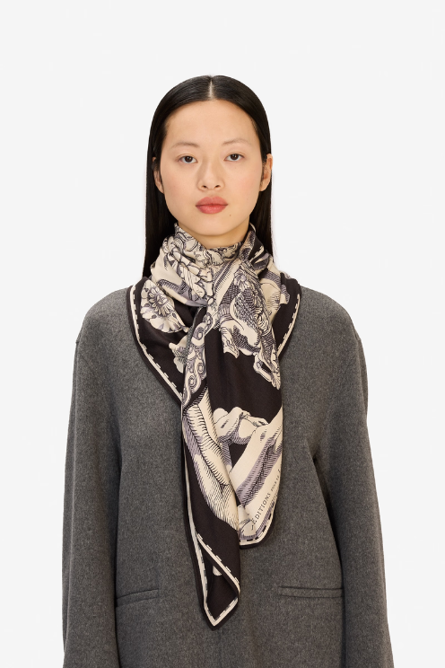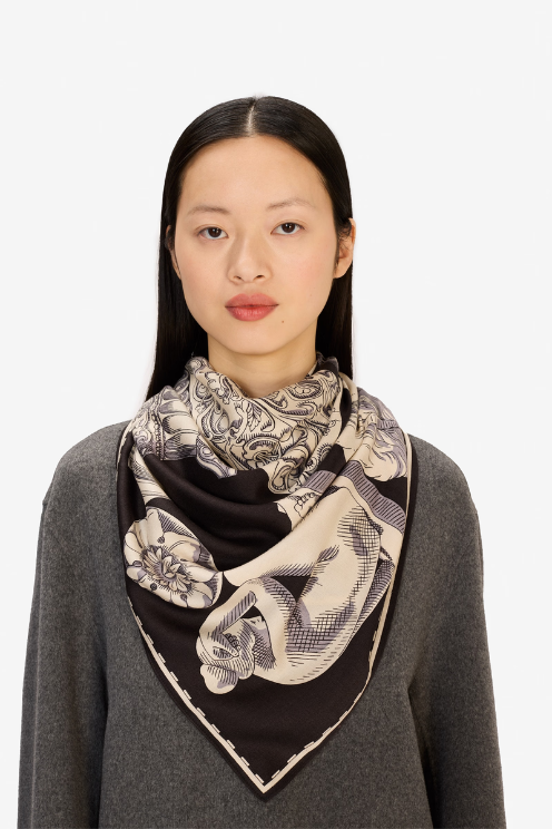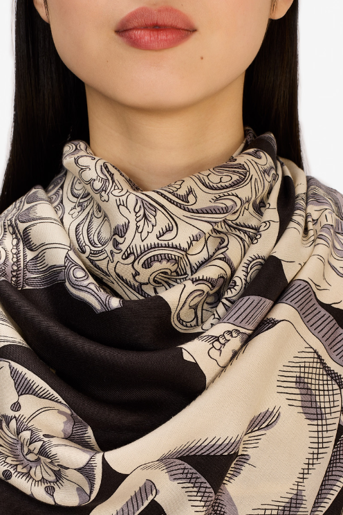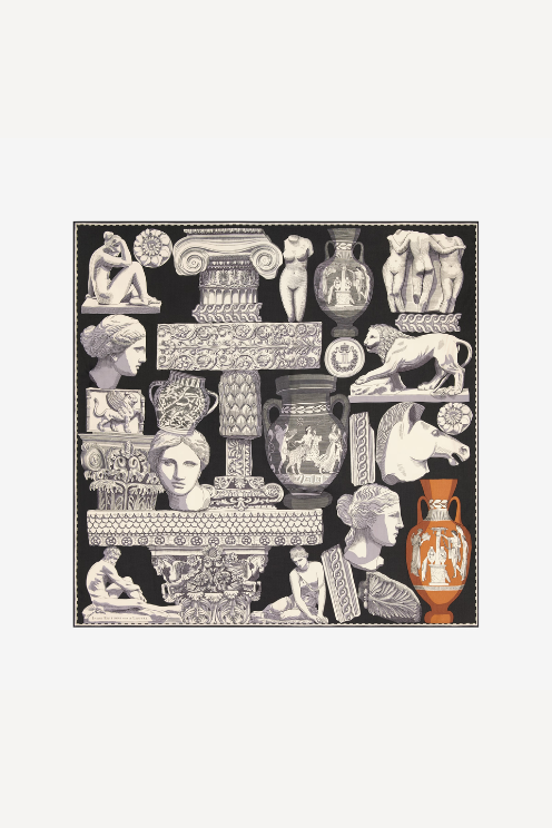 Evoking the grandeur of ancient art, the Archives Square captures timeless beauty through its intricate illustration of classical statues, vases, and architectural motifs. The rich black background contrasts elegantly with soft ivory detailing and a touch of terracotta, creating a piece that feels both modern and historical. Crafted from a luxurious silk-modal blend, it drapes with effortless softness and sophistication.