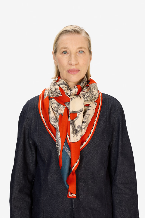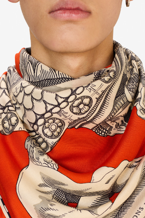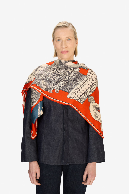 Bold and artistic, the Archives Square in Orange reimagines classical sculpture through a modern lens. Its intricate composition of statues, columns, and Greco-Roman motifs comes alive against a striking orange backdrop accented with deep navy and ivory tones. Crafted in a luxurious silk-modal blend, this piece combines heritage-inspired design with a soft, fluid drape — a true statement accessory.