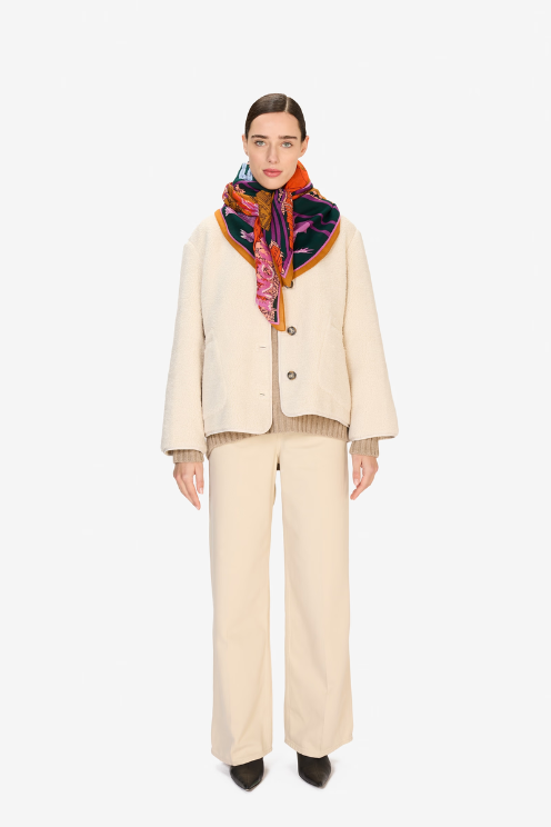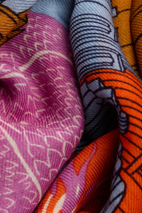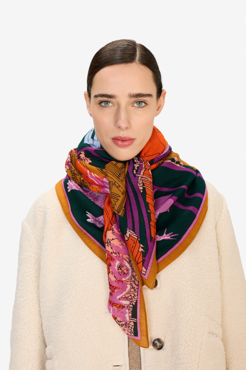 Vibrant and playful, the Vegas Square brings a surreal cityscape to life with whimsical dinosaurs roaming through bold architectural motifs. A striking mix of purple, orange, pink, and teal makes this scarf a true statement piece. Crafted from 100% wool, it’s soft, warm, and effortlessly expressive — perfect for adding a touch of artful edge to any look.