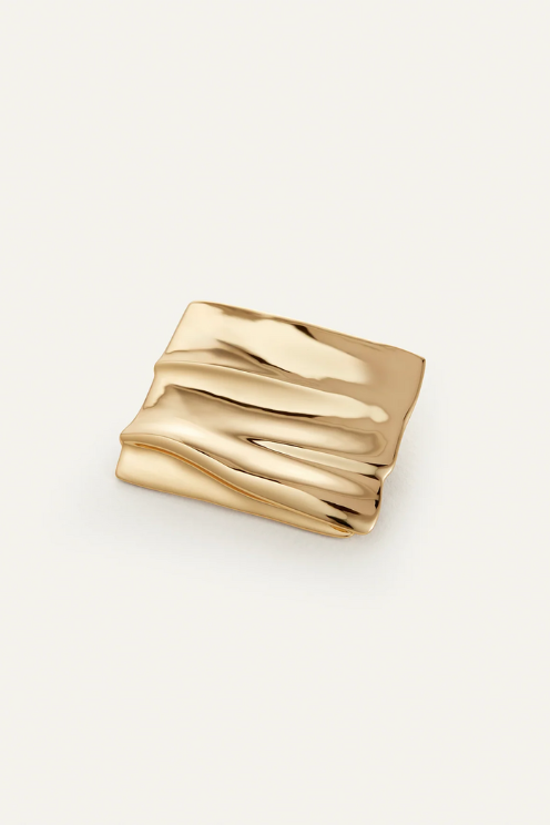 A tile-shaped brooch with a surface that mirrors the natural grooves found in sand dunes. Outfitted with a pin on a hinge and finished in high-polish gold.