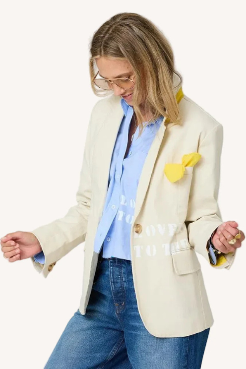 The Love Rises blazer is wearable art with intention. Finished with Kerri's hand-stamped artwork and a heart-shaped hanky in the pocket, this is a timeless silhouette. Style it casually with denim and a tee, or layer it over a sweater or button-down for a more polished look. This blazer is designed to move easily, between work, weekend, and everything in between, adding personality to any outfit.