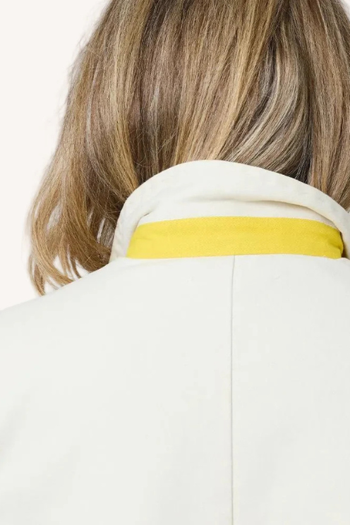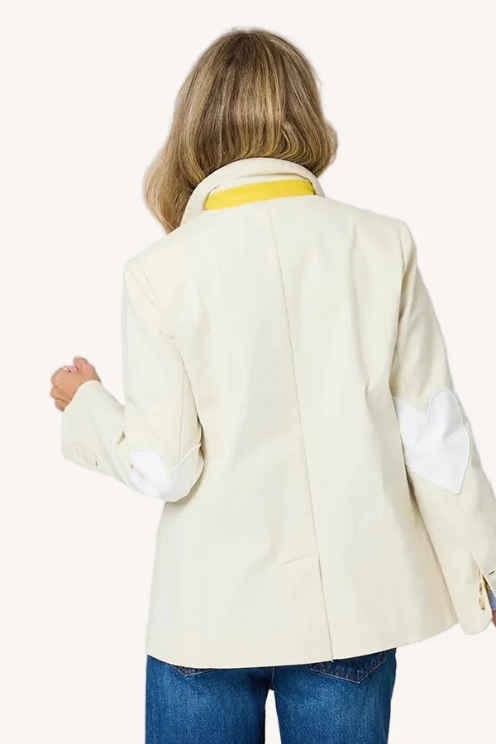 - Single breasted blazer, one top pocket with a removable heart shaped hanky, artwork stamped on side, contrast white Imperfect Heart elbows, yellow under collar.