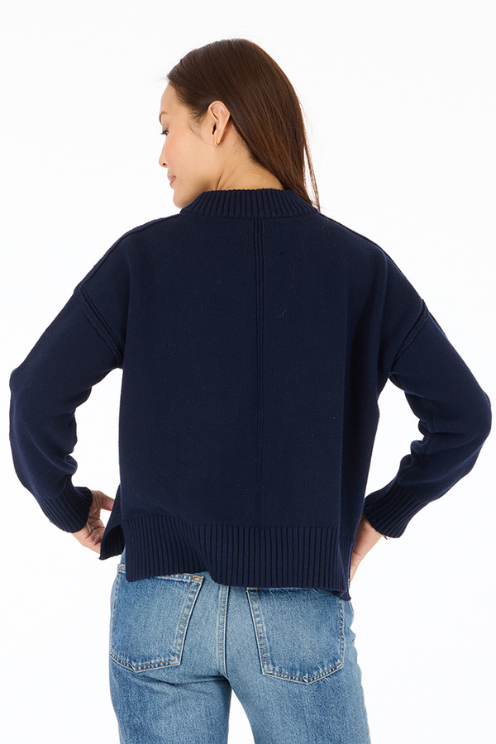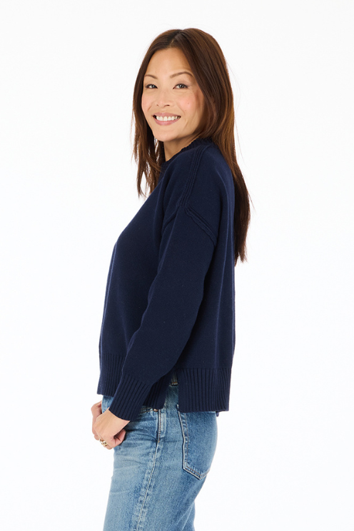A cozy essential with a playful twist, this Kerri Rosenthal sweater is crafted from a soft blend of 95% cotton and 5% cashmere. The navy knit is detailed with colorful “Peace + Love” embroidery across the chest, adding a cheerful pop of personality. Designed with a relaxed fit, dropped shoulders, and ribbed trim at the cuffs and hem, it’s the perfect piece for effortless everyday wear. Style it with denim or layer it over tailored trousers for a laid-back yet polished look.