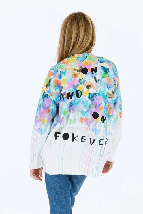 Wrap yourself in cozy charm with the Slouchy Love Adorned Cardigan, featuring Kerri’s exclusive 'Love Adorned' artwork printed on both front and back. Made from 100% cotton, it’s perfect for layering with a playful touch. Four embroidered buttonholes and buttons provide a stylish closure, making it easy to mix and match. For the ultimate look, pair it with the matching KR wrap and show off your collector’s style.