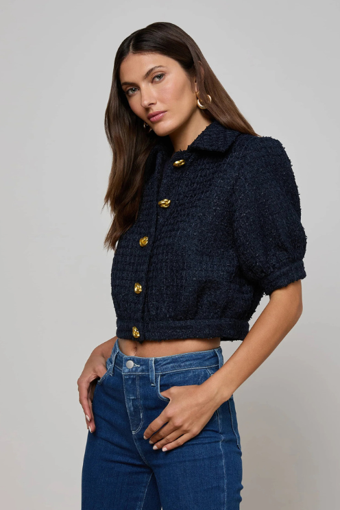With an ultra-feminine cropped silhouette and puff sleeves, our cropped Cove does double duty as a chic jacket or top. Now in a midnight textured tweed.