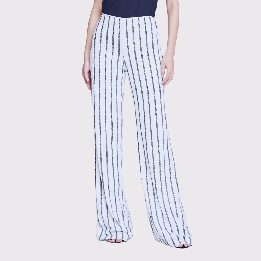 In need of something glamorous? Introducing the Sapphire Straight Leg Pant by L'Agence. These pants feature a mini sequin design complimented by black and white pinstripes, a relaxed fit, and a straight-leg style. Style these pants with a simple cami and complete the look with some heels to be all set for a night out!