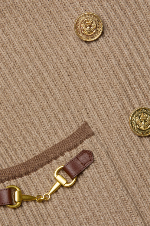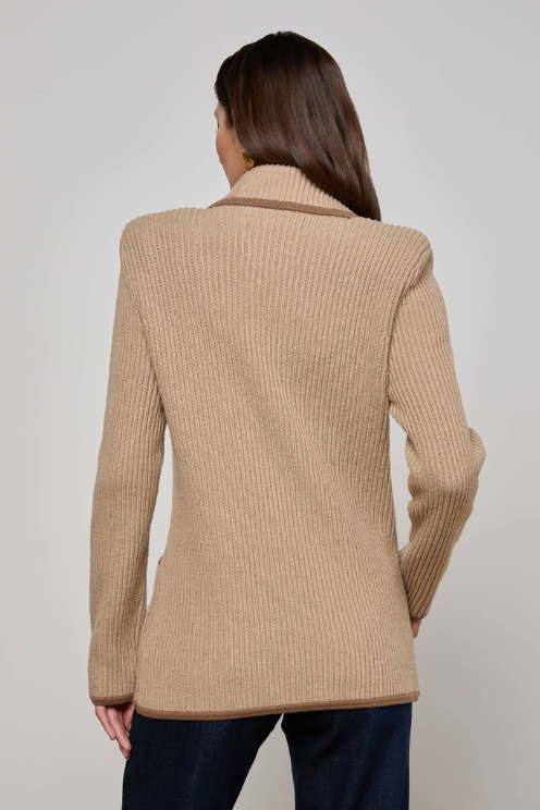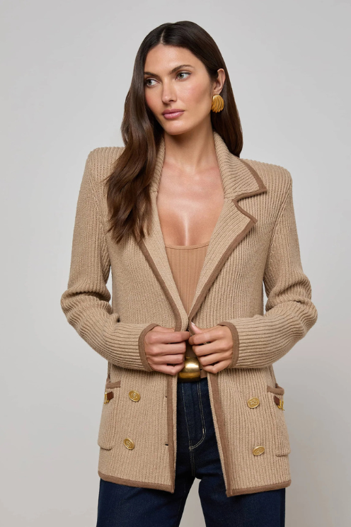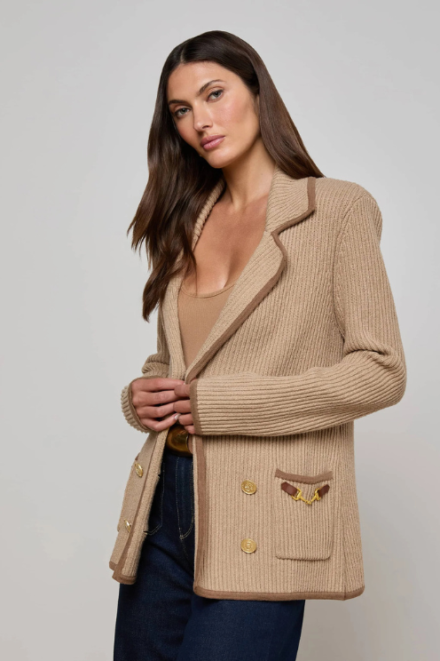 The Ranch brings laid-back elegance to the classic blazer silhouette. Crafted in structured ribbed knit, it features a double-breasted front, notched lapels, and contrast trim. Coin buttons and horse bit accents add refined distinction, making it a standout piece for desk to drinks.