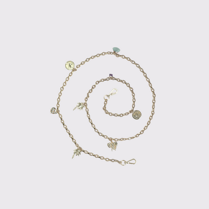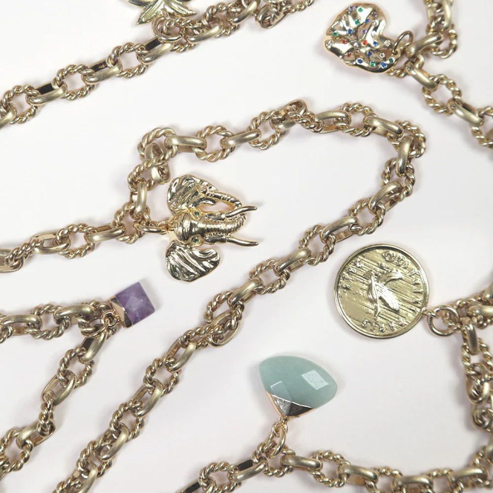 The LUCKY chain is gold-plated with small twisted links and embellished with an array of 8 playful lucky charms (heart, elephant, stone, palm tree, medal...) ! A touch of vintage combined with symbols of happiness !