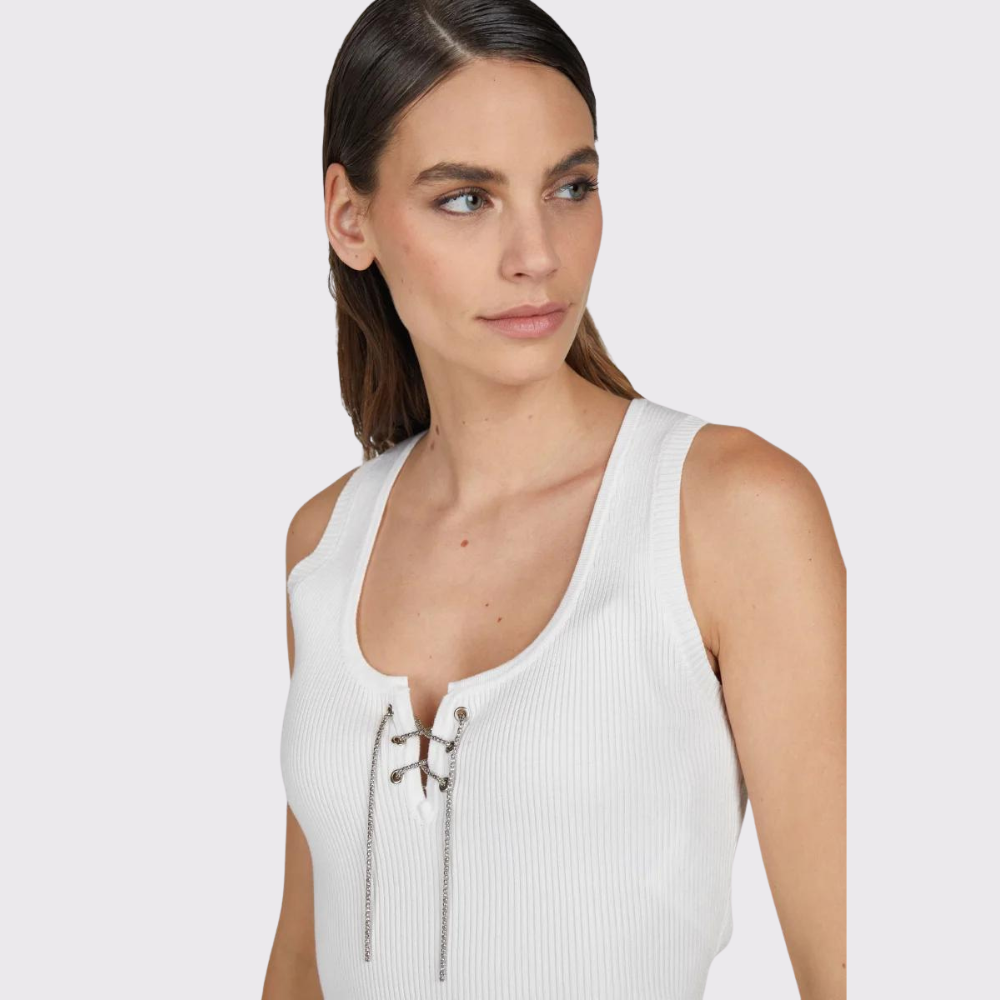 Elevate your style with our Marc Aurel Ribbed Chain Tank. Made from stretch viscose rib for a slim fit, this elegant top features a unique ribbed chain pattern. Perfect for any occasion, it adds a stylish touch and offers versatile combinations. Make a fashion statement with this must-have piece!