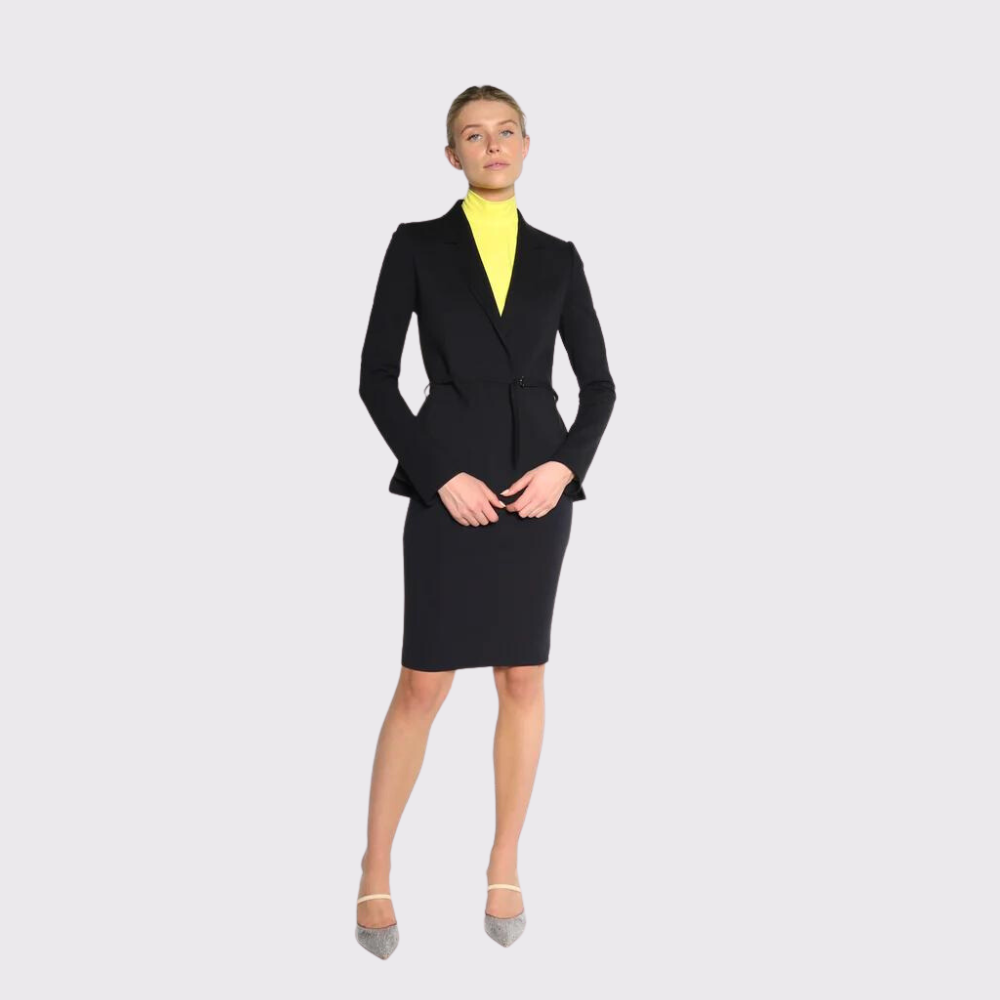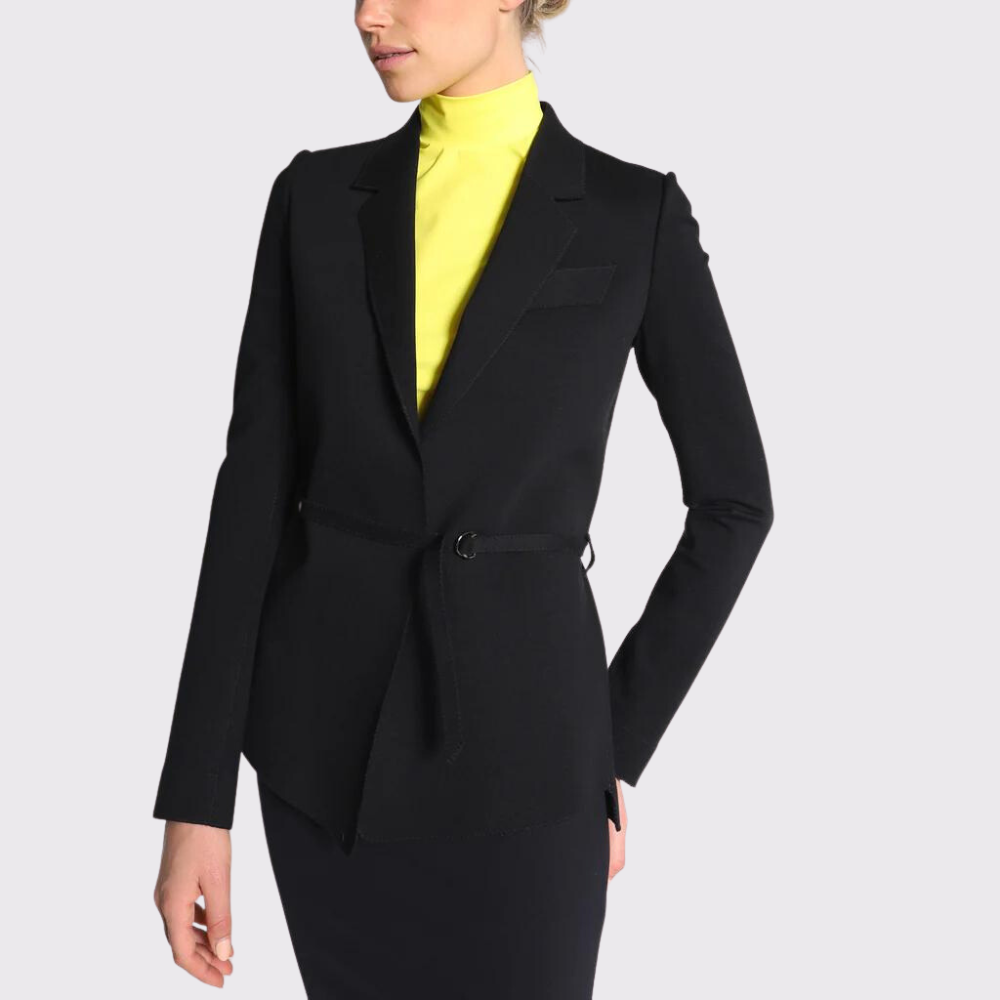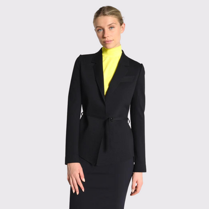 Make a statement wearing Marie Saint Pierre's iconic Anna blazer Its classic cut is designed in double jersey, with classic tailored collar and notched lapels. Details such as faux breast pocket, and removable belt make this jacket a sophisticated wardrobe staple. Wear it to stand out with confidence!