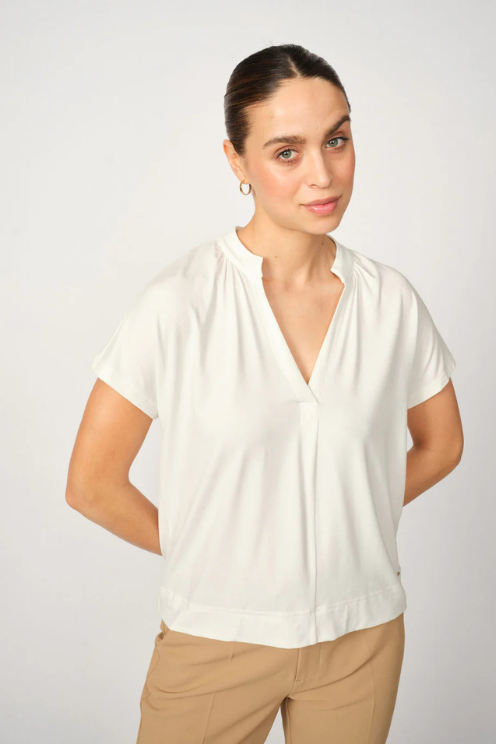 A soft and elegant tee designed in a relaxed silhouette with a flattering V-slit neckline. The smooth, lightweight fabric drapes beautifully, making it perfect for both layering and stand-alone wear. Pair it with tailoring for a refined look or jeans for effortless everyday style.
