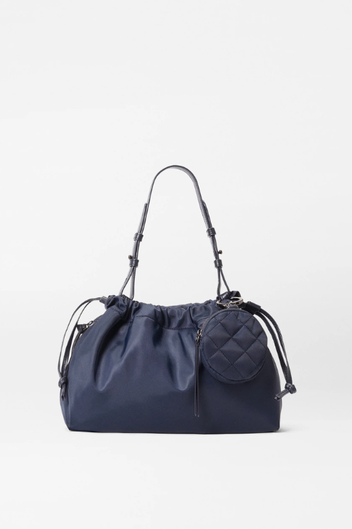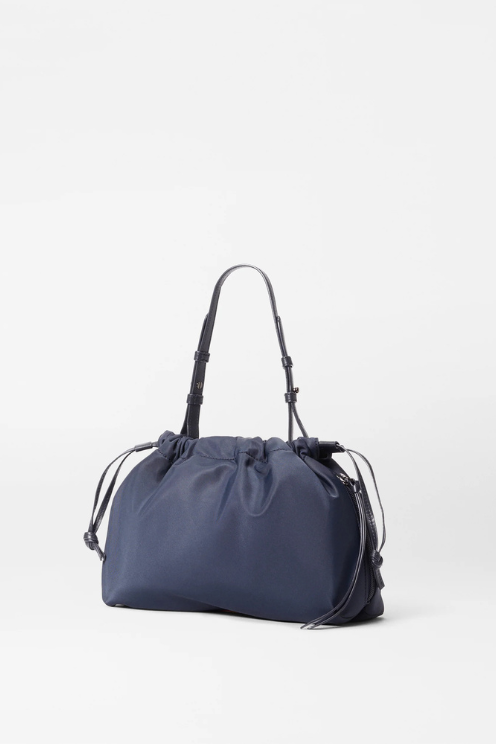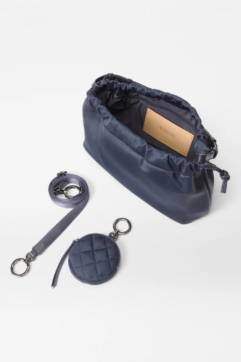 The Mz Wallace Small Waverly Shoulder bag blends refined craftsmanship with practical design. Made from durable REC Bedford Fabrication and accented with Italian leather trim, it features a sleek Italian leather handle and gunmetal hardware for lasting quality. The interior includes three pockets, blue lining, and a detachable pouch for organized storage. A detachable, adjustable nylon crossbody strap adds versatile carrying options, while an exterior pocket provides quick access to essentials. Compact yet spacious at 5 liters, this lightweight 0.3 kg bag measures 28 cm by 20 cm by 9 cm, perfect for everyday use with expert style.