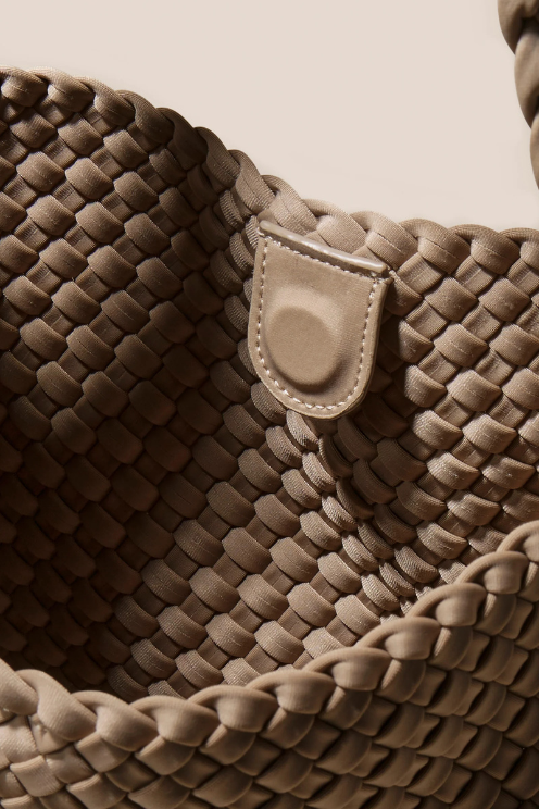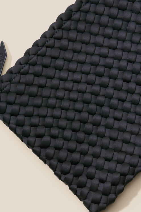 This essential woven neoprene hobo bag features an open top with magnetic snap closure, a matching zippered pouch, and an unlined interior for a soft, flexible feel.