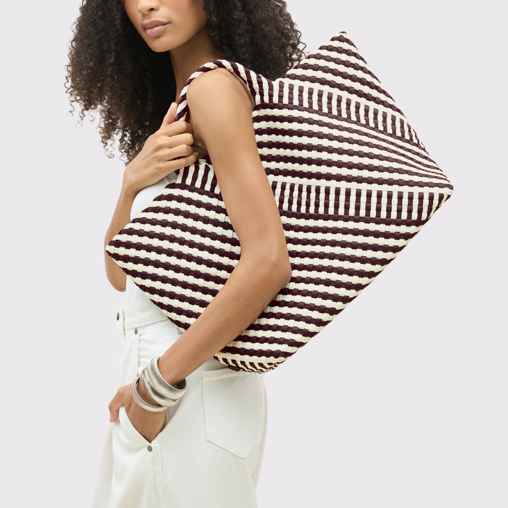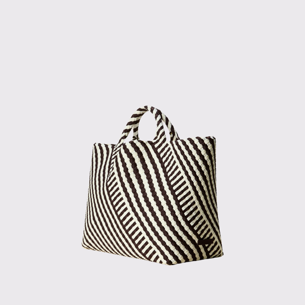 The Naghedi St. Barths Large Tote Striped Raveena is a lightweight and versatile classic, perfect for travel. Made of handwoven neoprene in chocolate brown and white, its striped geo design adds an optic twist to traditional stripes. The handles also gently stretch for a comfortable fit on your shoulder.
