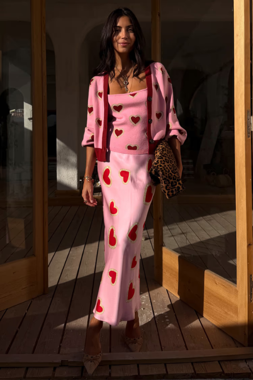 This cardigan is definitely bring a touch of NFD flare to your wardrobe! Ideal for the season, a light throw over for when it gets chilly in the evenings, the knitted fabric is so soft to the touch and feels weighty to drape the frame nicely. Embroidered with our new heart motif print, pair with the matching knit tank or elevated even further with our pink hearts dorris skirt for an effortlessly cut co-ord.