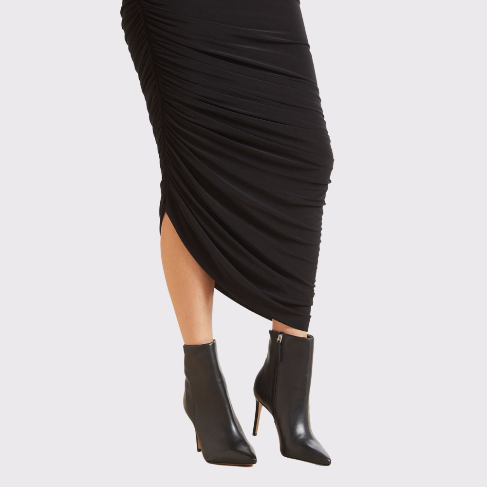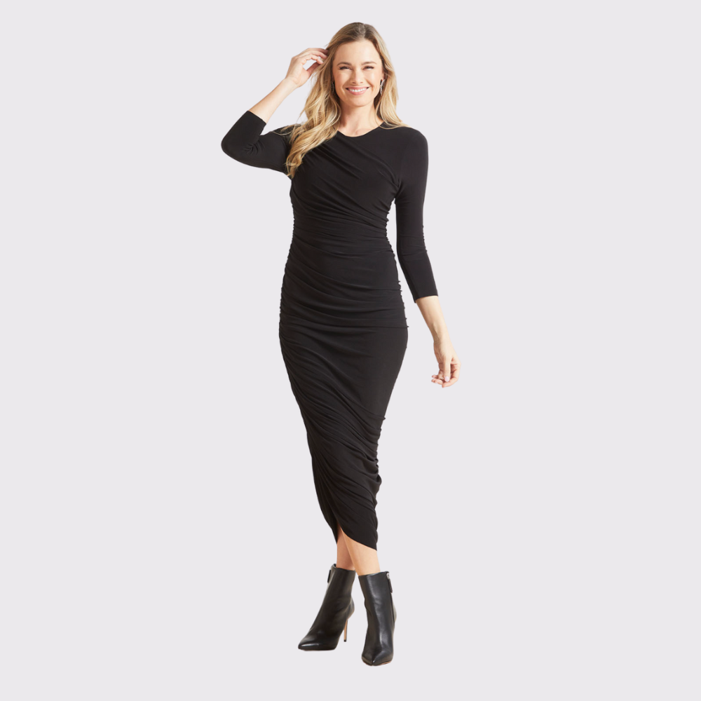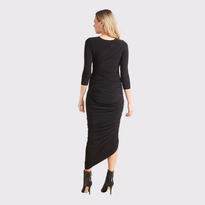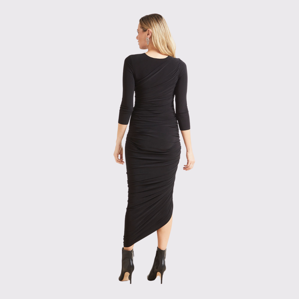 You will feel like a Princess in this dress! With beautiful and elegant long sleeves, shirred sides and an asymmetrical hem, this look is flattering on every body type. It also has an added 4-way stretch body suit for added comfort and to create this drape look.