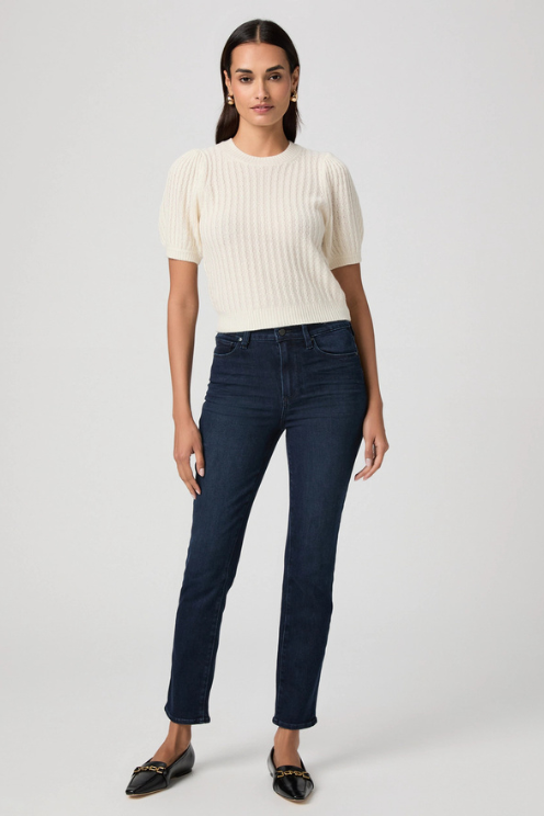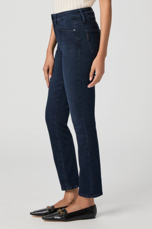 Gemma is our modern update on the classic skinny, with a high-rise slim cigarette leg and an ankle length inseam. Cut from TRANSCEND VINTAGE denim in a super dark blue/black wash with soft, subtle contrasting hardware and a black back patch, this pair combines the signature comfort of Transcend with rich denim character for a lived-in look.