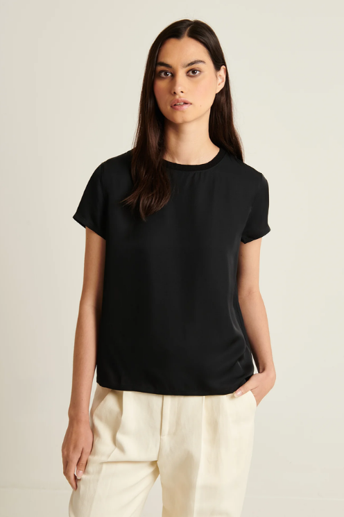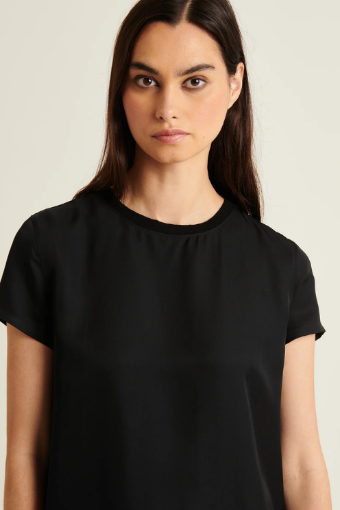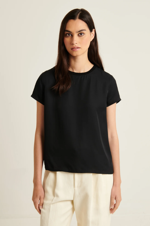 Slim silk shirt is crafted from a premium quality mid-weight 100% silk fabric and was inspired by our best-selling t-shirt silhouette. It is cut in a relaxed fit featuring a true shoulder and feminine ribbed neck trim.
