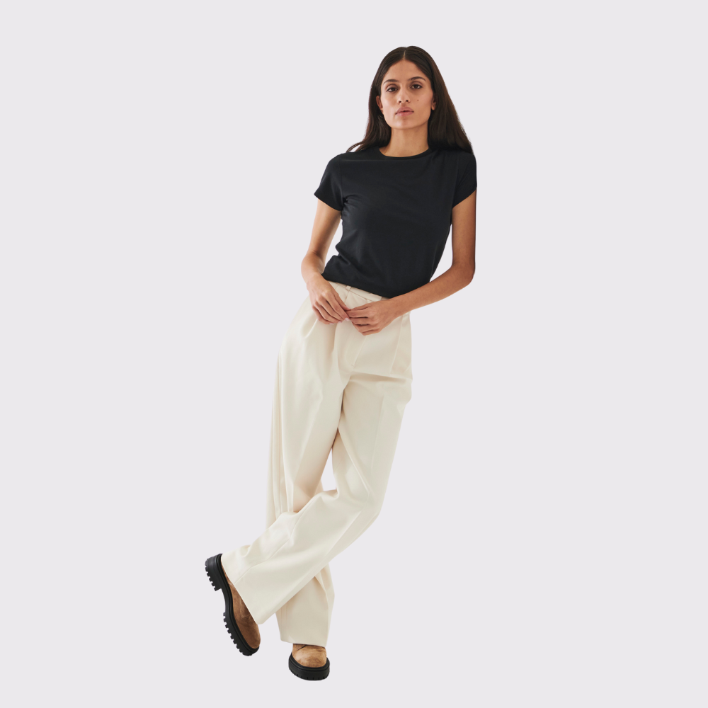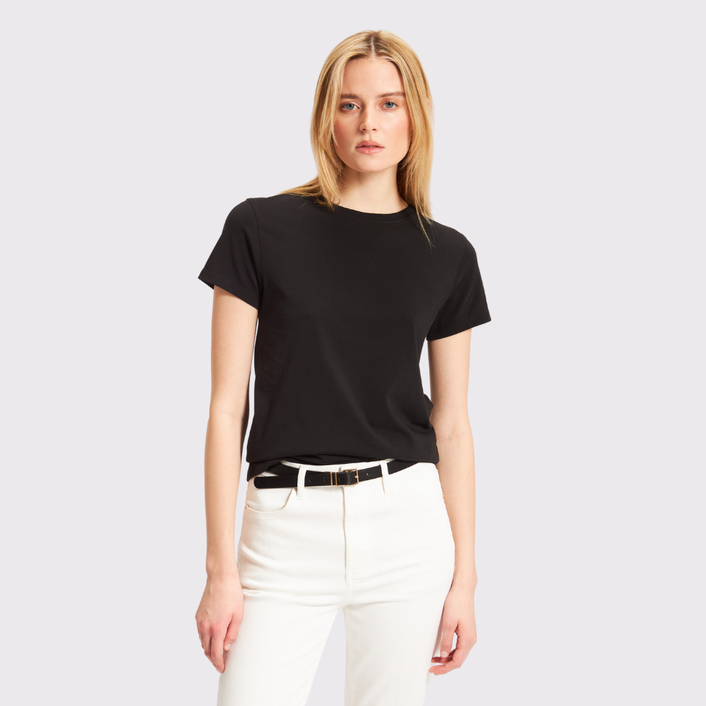 Introducing the Patrick Assaraf SS Iconic Fitted Crew. This basic black tee is designed to be a high quality wardrobe staple. With its true-to-size fit, it is a must-have for any stylish individual. Upgrade your wardrobe with this versatile and timeless piece.
