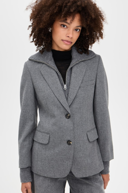 Suit yourself. This two-button blazer has a cinched waist and falls below the hip. Crafted from a wool blend with a satin lining, it pairs a soft feel with a structured look. An accompanying sweater inlay can be zipped in or out to whenever you want to create a cool layered look.