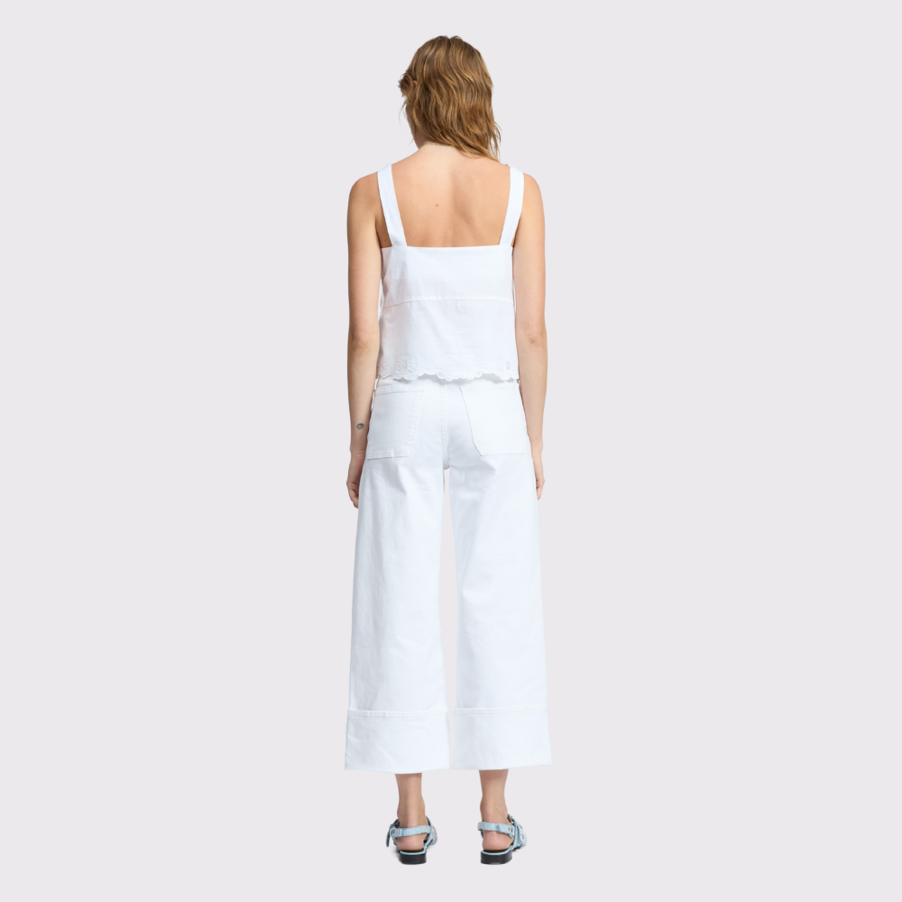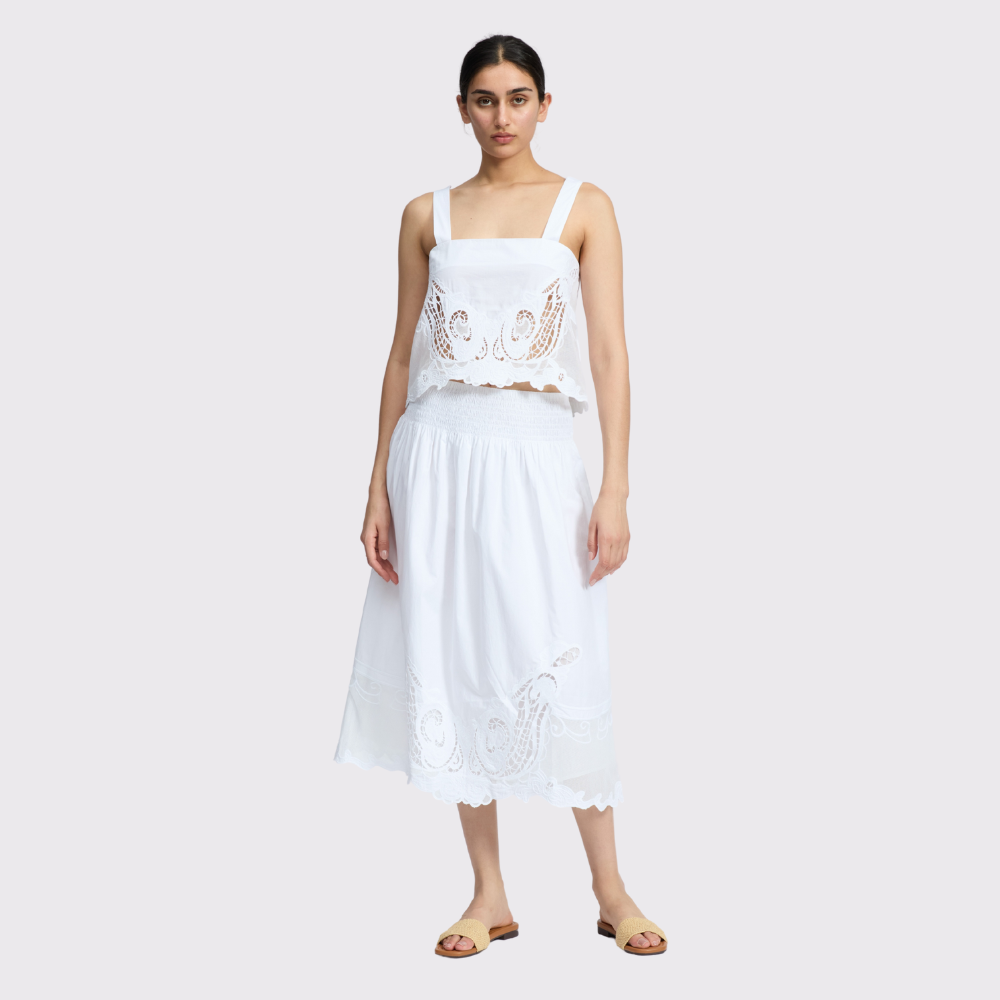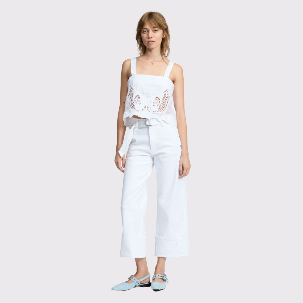 This breezy white cotton tank features wide straps and a delicate lace cutout design across the front, adding a romantic touch to a classic silhouette. Slightly cropped with a soft, scalloped hem, it's perfect for warm weather styling.