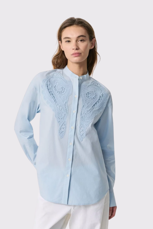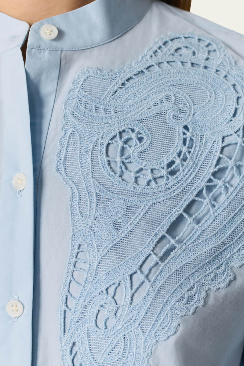 Crisp cotton meets feminine detail in this refined blouse, featuring tonal embroidery and openwork lace along the front bib. The band collar and full-length sleeve keep the look tailored, while the intricate design adds a romantic twist