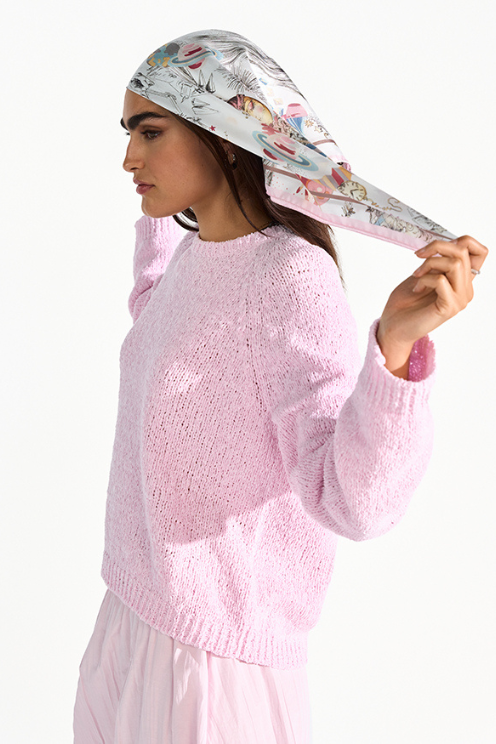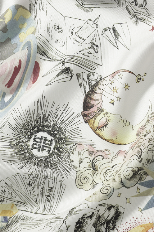 Magical Eye-Catcher – The RIANI silk scarf with its unique Dreamscape print transports into a whimsical world. Inspired by “Conversationals,” prints that tell stories, it combines fairy-tale motifs like unicorns, a cat by the window, the moon, and gemstones into an artistic design. The noble fabric feels soft against the skin and adds a special touch to any outfit. An accessory for dreamers and style enthusiasts.