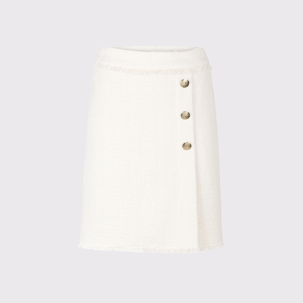 The Riani Tweed Skirt is an effortless way to instantly elevate your wardrobe. This stunning piece features an off white tweed material finished with shimmering gold buttons - perfect for making a statement! Pair with your favourite