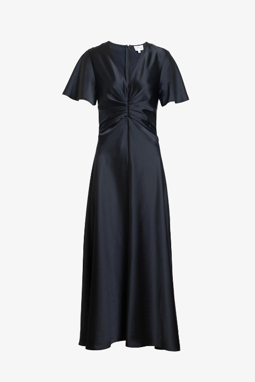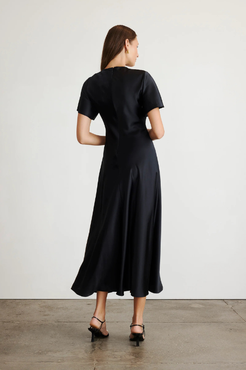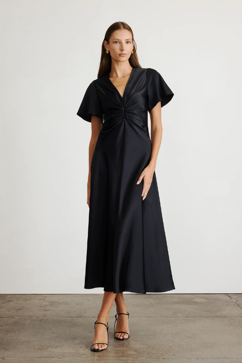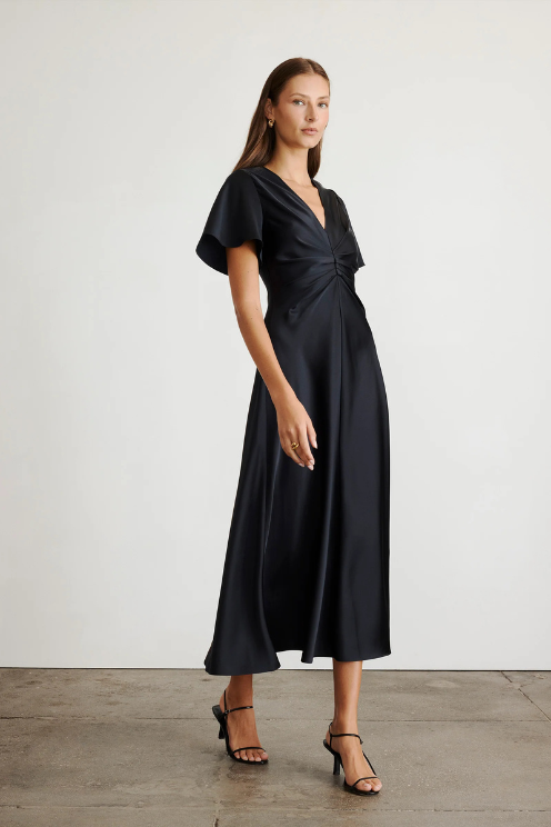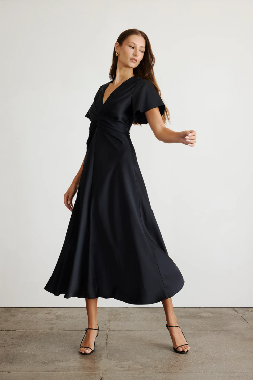Crafted from a luxe satin crepe, this timeless silhouette features a romantic v-neck into a pleated bodice, flutter sleeves, and a bias that flatters effortlessly.