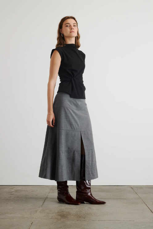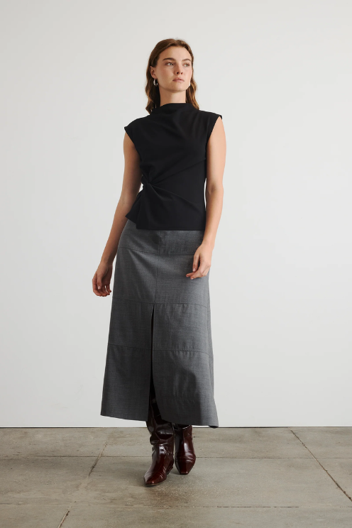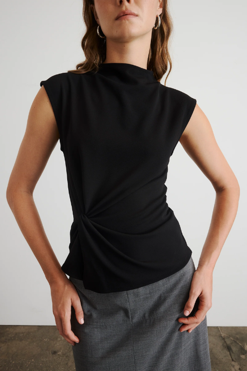 Crafted from luxe scuba crepe, the Robin Top offers a sleek, polished silhouette enhanced by a modern twist at the waist that flatters every figure. Its mock neck and cap sleeves add subtle sophistication, making it an effortless choice to elevate any outfit with refined style.